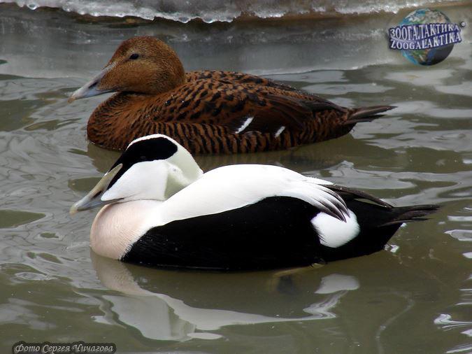 Гага — это большая утка, которая весит столько, сколько два больших пакета молока! Есть гаги-мальчики, у которых очень яркое и красивое оперение: белое, черное, даже немного розовое и зеленое. А гаги-девочки серенькие и скромные, чтобы хорошо прятаться среди камней и травы.