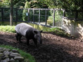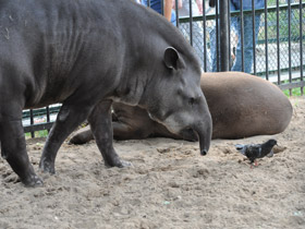Семейство Тапировые (Tapiridae) - вероятно, самые древние и примитивные из Непарнокопытных. Название этих животных на языке одного из бразильских племен означает "толстый" и получили они его из-за своей толстой кожи. Тапиры обитают в Южной Америке и Юго-Восточной Азии, где населяют болотистые леса и кустарники по берегам рек и озер. 4 современных вида - остатки некогда обширной группы, ареал которой распространялся на все Северное полушарие. Самая удивительная черта их строения - небольшой вытянутый и подвижный хоботок, образованный сросшимися носом и верхней губой и используемый для обрывания листьев или молодых побегов. У тапиров четыре пальца на передних ногах и три на задних, причем каждый палец оканчивается маленьким копытцем. Такое строение конечностей помогает животным передвигаться по мягкой болотистой почве. Хвост у тапиров короткий и как бы обрубленный.