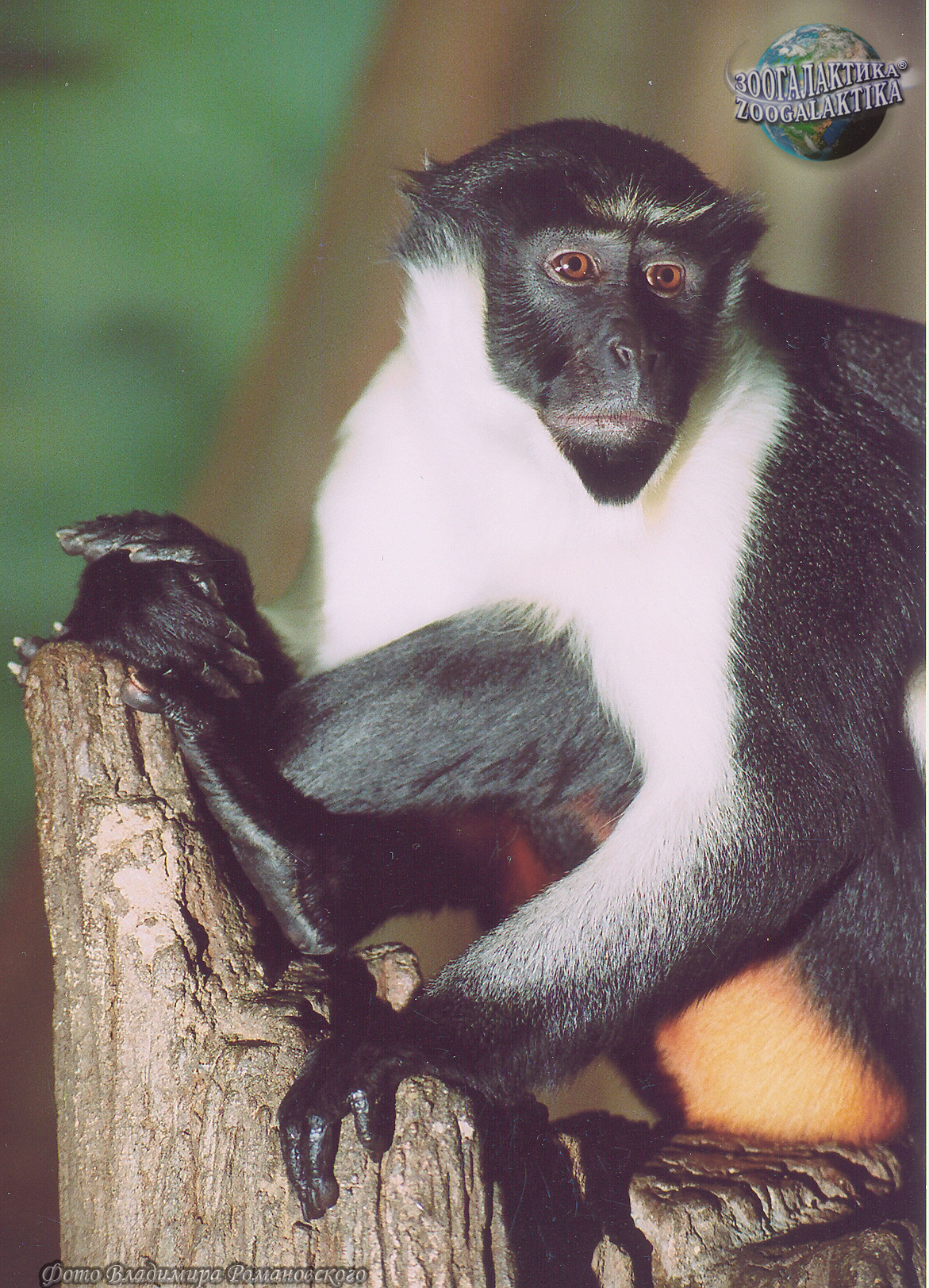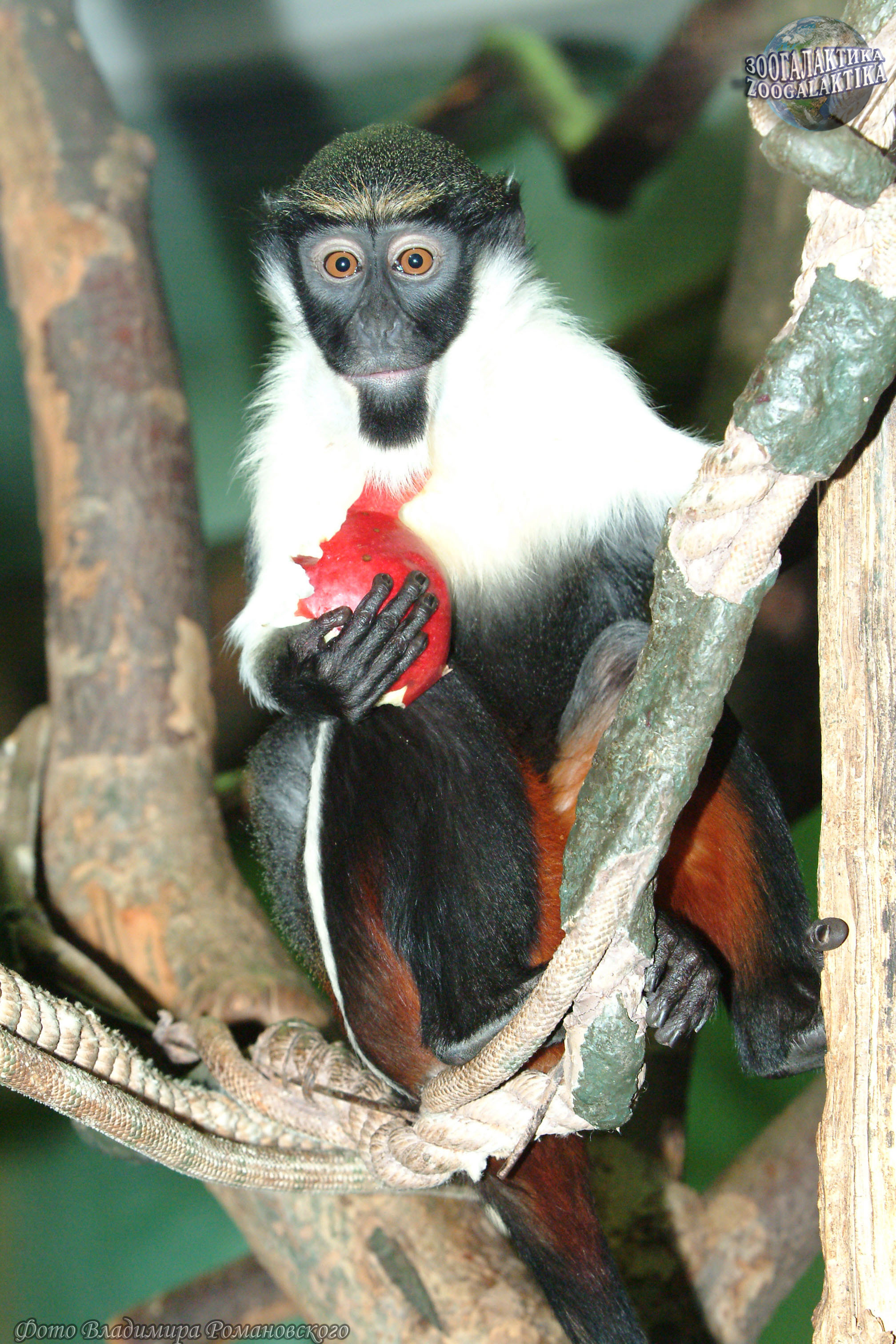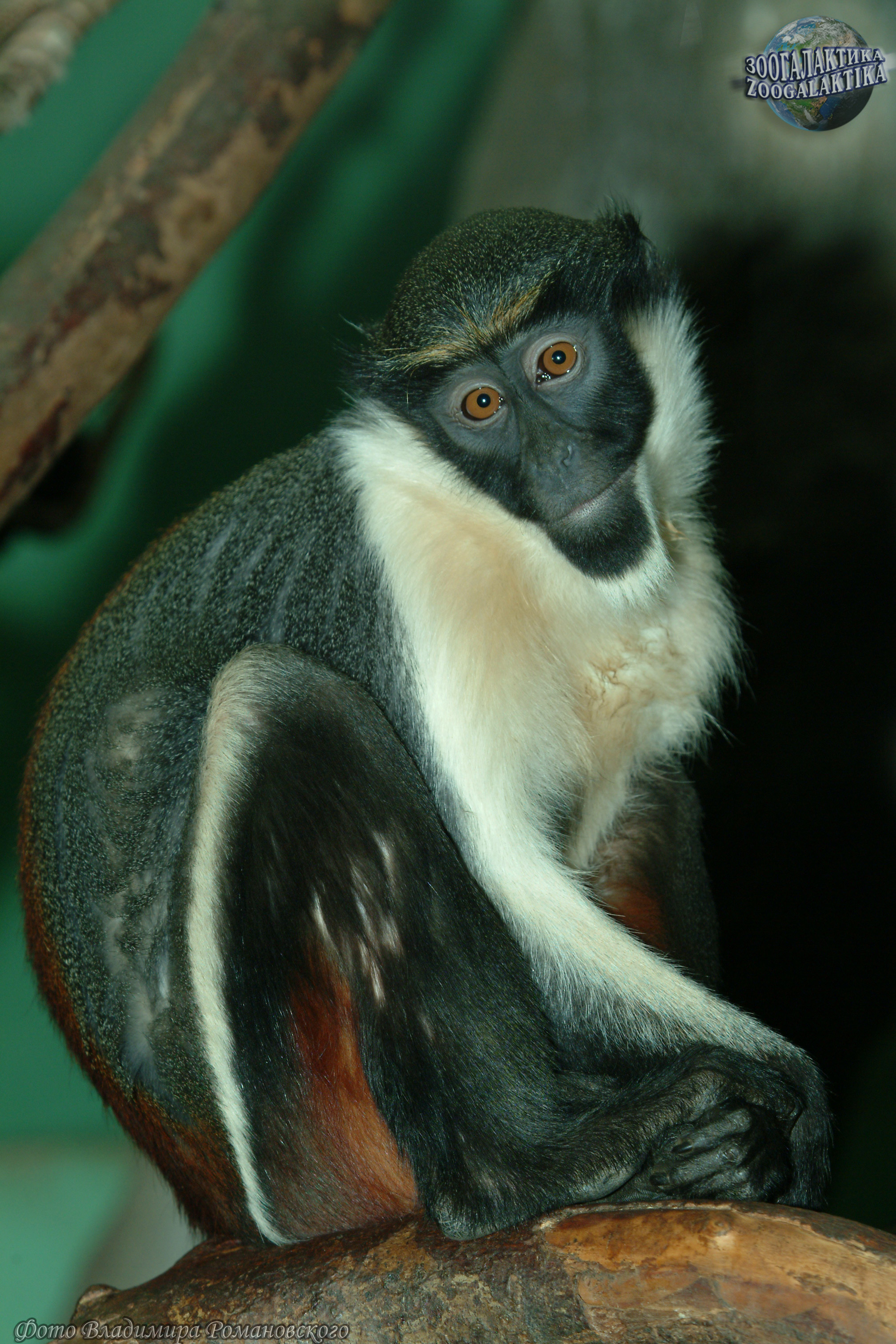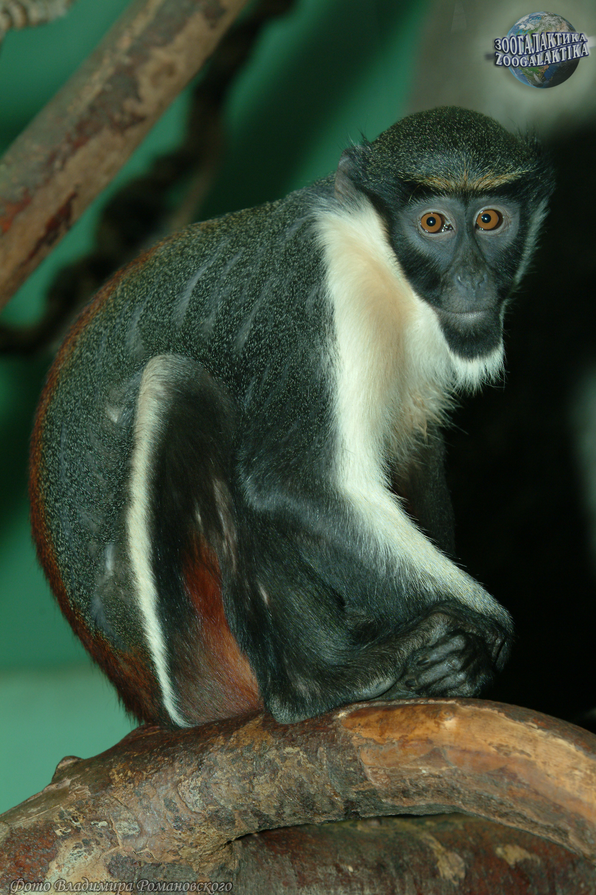 Мартышка-диана (Cercopithecus diana) - один из красивейших представителей своего семейства. Шерсть у нее на груди белая, на спине и крестце - пурпурно-коричневая, нижняя часть тела - кремовая, а внутренняя поверхность бедра оранжевая; лицо черное, а борода белая.