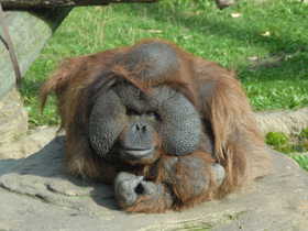 Название “оранг-утан” в переводе с малайского означает “лесной человек”. Орангутан (Pongo) - одна из самых крупных обезьян (вес самца орангутана может достигать 100 кг, длина тела - до 150 см, размах рук - до 2,25 м). Самки значительно мельче - их вес всего 40-50 кг. Сложение у “лесных людей” довольно неуклюжее: передние конечности сильно удлинены, ноги относительно короткие, большой живот. Кисти и стопы этих приматов прекрасно приспособлены к жизни на деревьях - 4 пальца кисти схватывают ветви, подобно мощному крюку. Головной мозг у орангутанов большой, достигает 300-500 куб. см и по строению очень похож на человеческий.